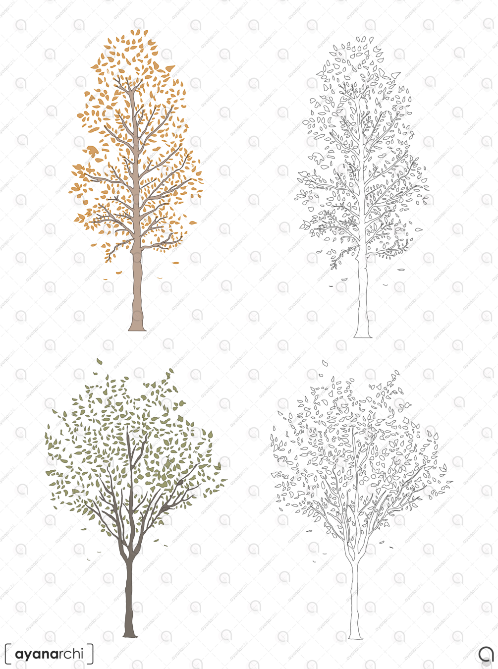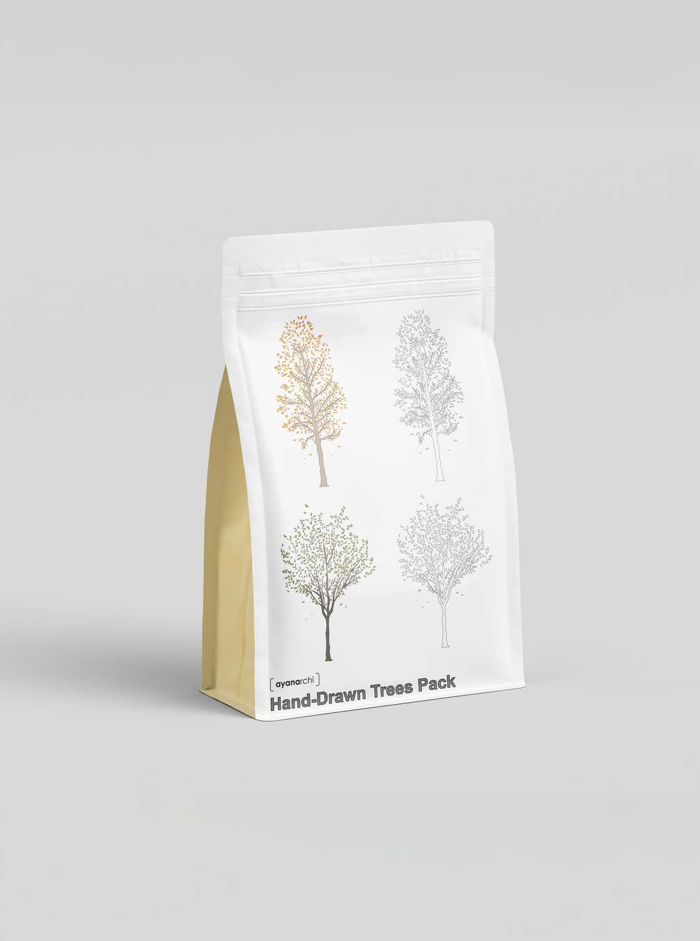 This pack offers a curated set of fully hand drawn tree elevations designed for sections, elevations, site diagrams, and perspective drawings. Each tree focuses on structure, proportion, and readability, supporting architectural drawings with calm, controlled vegetation rather than visual noise.